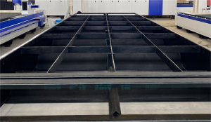 The RAYMAX 6022D 6KW single-table fiber laser cutting machine features a working table size of 6000*2200mm and a total power of 46,000W. Its main structure adopts a gantry design with a high-damping bed, ensuring excellent rigidity, high precision, and stable operation. The machine uses a dedicated welding platform with an overall level accuracy of ≤0.5mm, ensuring the precision of the bed’s welding. The overall welding accuracy is ≤5mm. The machine undergoes high-temperature annealing and secondary aging treatment, and is processed using large gantry milling machines. These design and manufacturing techniques ensure the machine has outstanding vibration resistance, high stiffness, and stability, fully meeting the stability requirements for high-speed motion.